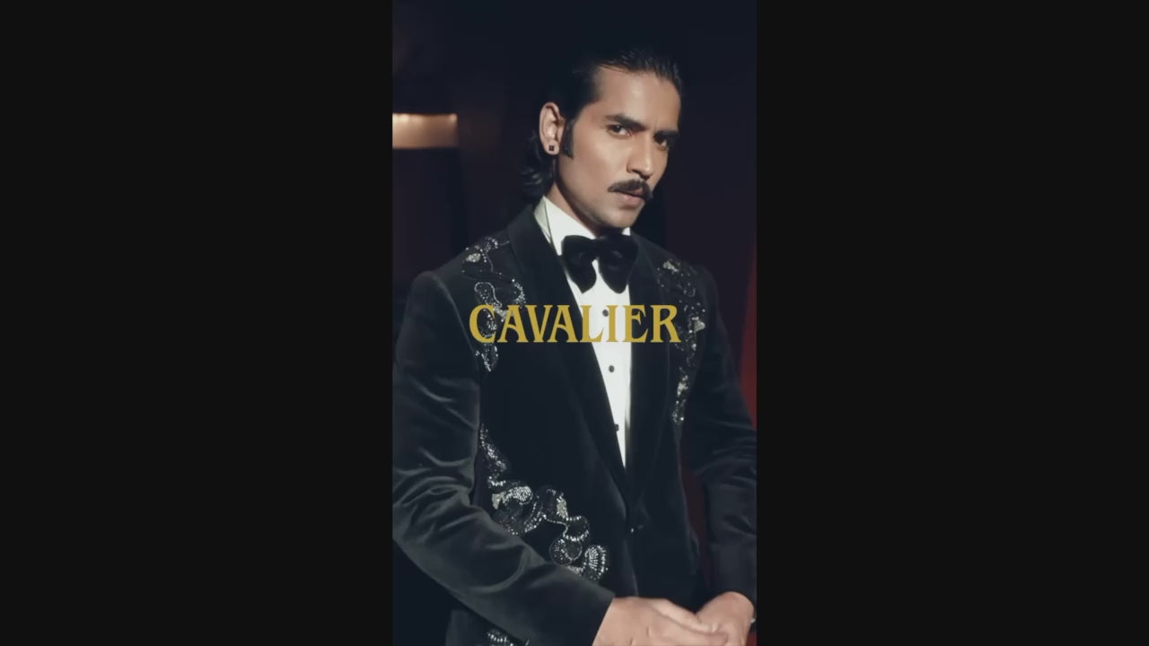 The Noir Serpent Velvet TuxedoA statement of dark luxury.Crafted from rich silk velvet, this tuxedo features hand-embroidered crystal serpents and sharp satin peak lapels for a look that radiates power and refinement.Designed for weddings, galas, and red-carpet moments, it embodies the perfect balance of boldness and elegance. Suit Color: Black with Silver Noir detailing...